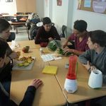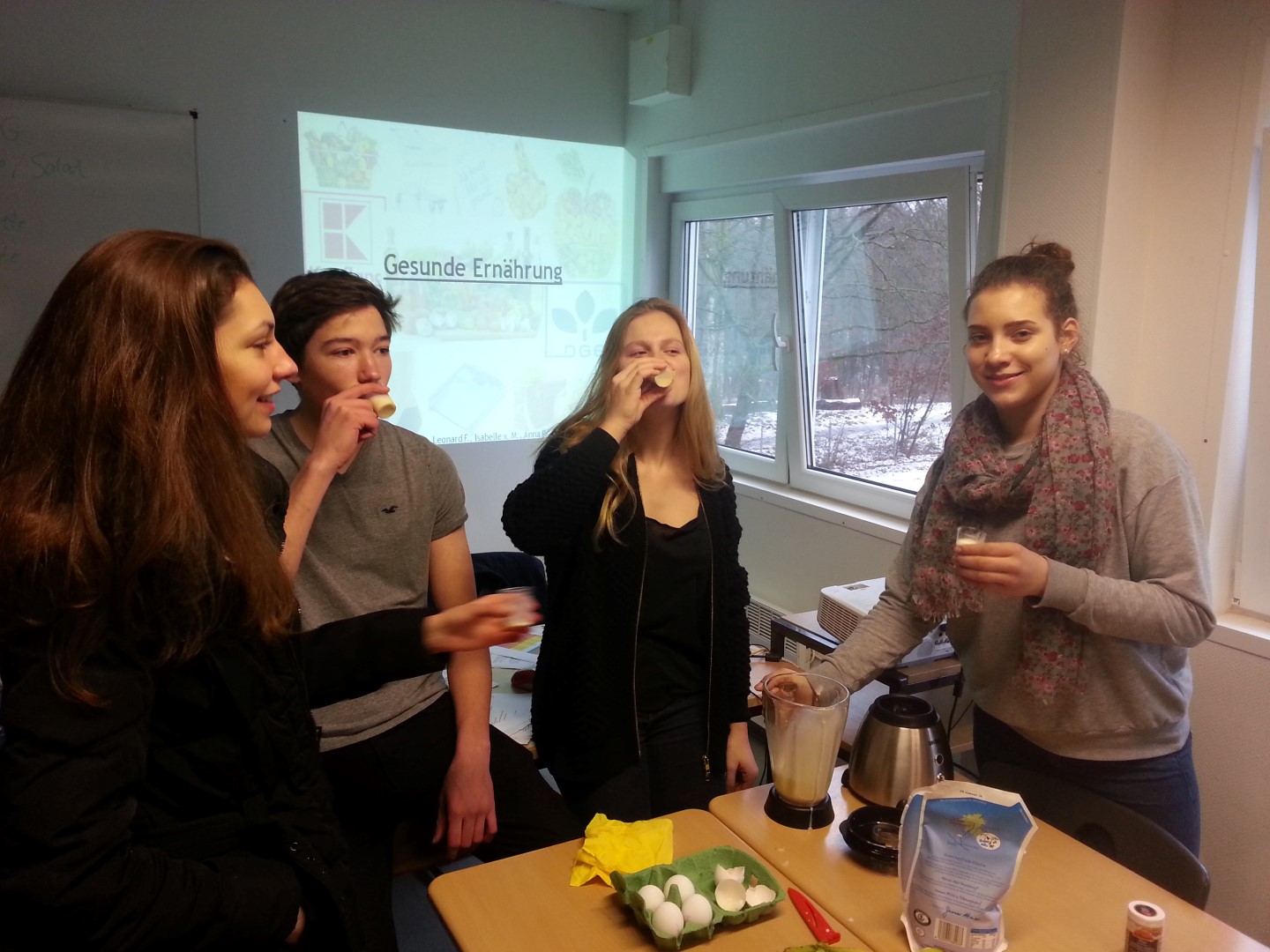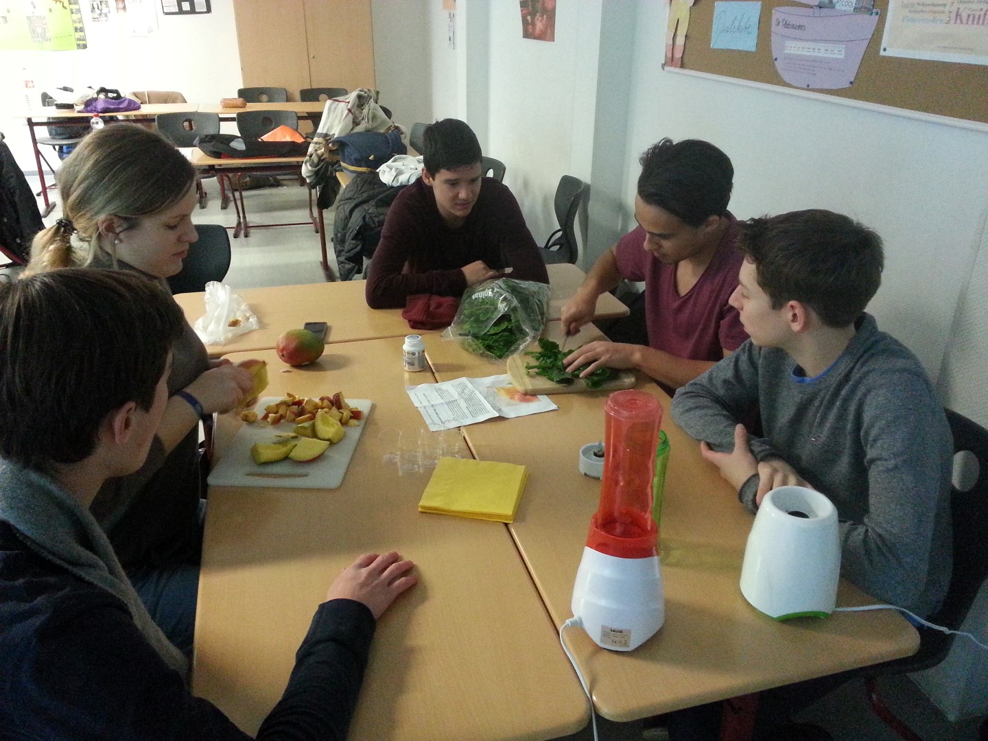 Nach Vermittlung des theoretischen Wissens wurden die Schülerinnen und Schüler in Gruppe eingeteilt und auf Grundlage eines Arbeitsauftrages, durch einen informierenden Text, angewiesen, einen Smoothie unter ernährungsspezifischer Grundlagen selbst zu kreieren. Die entsprechenden Rezepte basierten auf einem wissenschaftlichen Seminar bei einem Ernährungswissenschaftler, zum Thema „Ernährung", welches wir zuvor, bei als Arbeitsgruppe besucht haben. Insgesamt wurden nach einem gemeinsamen Einkauf (bei Kaufland), in welchem wir natürlich auf nachhaltig produzierte und regionale Produkte Ausschau hielten, drei verschiedene Smoothies hergestellt: einen für Diät bestimmten „Mango-Pfirsich-Smoothie" (kalorienreduziert), einen für Muskelaufbau (eiweißreich) bestimmten „Supergainer-Shake“ sowie einen für gesunde Ernährung (reich an Vitaminen und Mineralstoffen) bestimmten Smoothie mit dem Namen „Amazing Apple“.