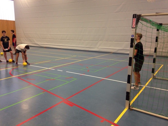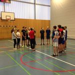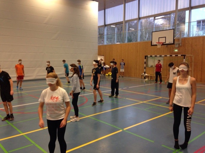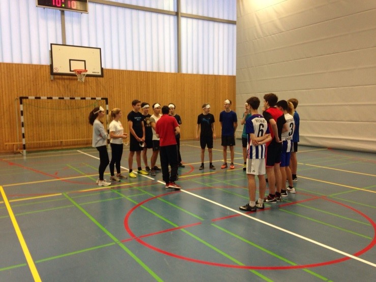 Zuallererst haben wir mit allgemeinen Orientierungsübungen begonnen, bei denen die Augen verbunden waren. Dies diente dazu, dass sich die Schülerinnen und Schüler daran gewöhnen sollten, sich ausschließlich mit ihren Ohren zu orientieren. Das gelang auch innerhalb weniger Minuten sehr gut. Im Anschluss begann dann das Training mit dem Ball, dabei haben die Übungen immer aufeinander aufgebaut. Der erste Teil des Trainings bestand aus einer Dribbelübung, die mit dem Passen verbunden wurde. Diese Übung gelang erstaunlich gut dafür, dass die meisten zum ersten Mal Blindenfußball gespielt haben. Zudem muss man berücksichtigen, dass auch nur wenige der Schülerinnen und Schüler überhaupt regelmäßig Fußball spielen. Nach einigen Torschussvarianten, bei denen schon des Öfteren kleinere Probleme auftraten kamen wir zum Abschlussspiel. Dieses haben wir jedoch etwas modifiziert, da nach so kurzer Zeit kein reibungsloser Spielverlauf entstehen kann. Jeder Spieler hatte einen Partner, der ihn mit Berührungen auf die Schultern geführt hat.