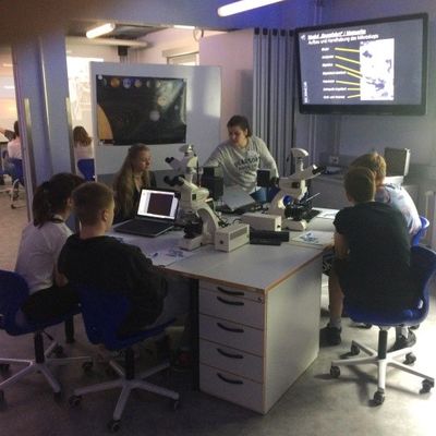 Das vierte Experiment beschäftigte sich mit Meteoriten und anderen Gesteinen. Zunächst wurden Gesteine aus dem Weltall mit Gesteinen von der Erde verglichen. Dann wurde eine Tabelle ausgefüllt, in der verschiedene Gesteine ihrer Herkunft nach geordnet werden sollten. Dazu wurden jeweils Proben unter dem Mikroskop betrachtet. Die dort festgestellten Merkmale konnten zur Zuordnung genutzt werden.