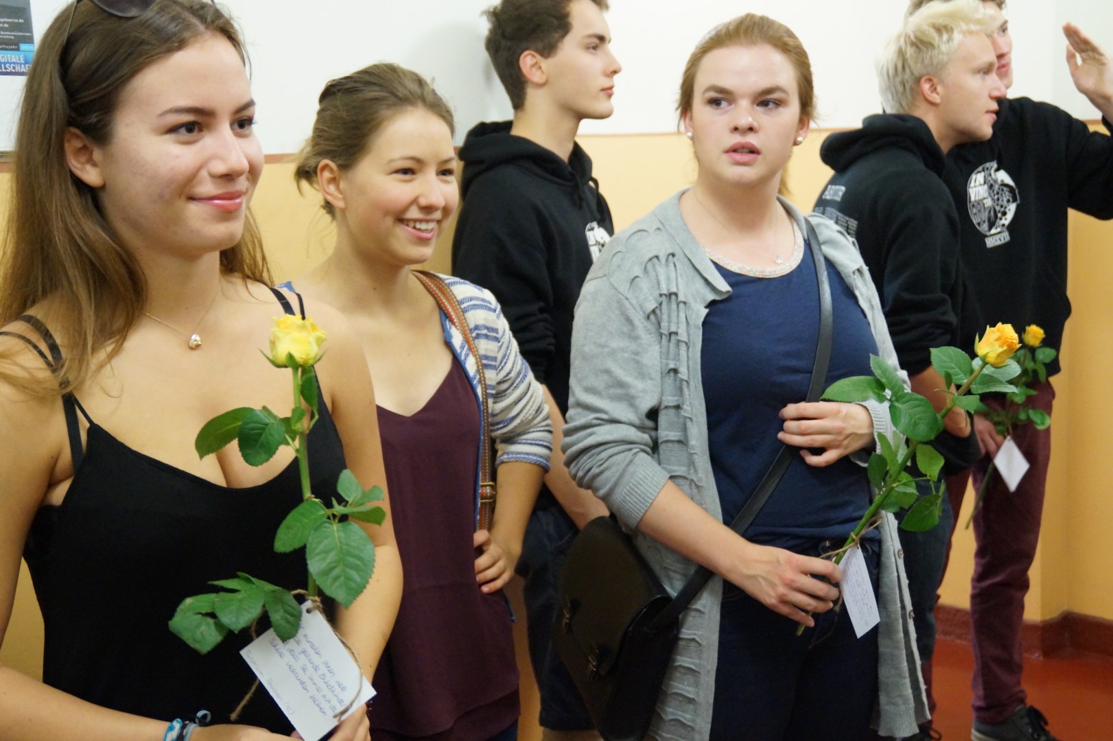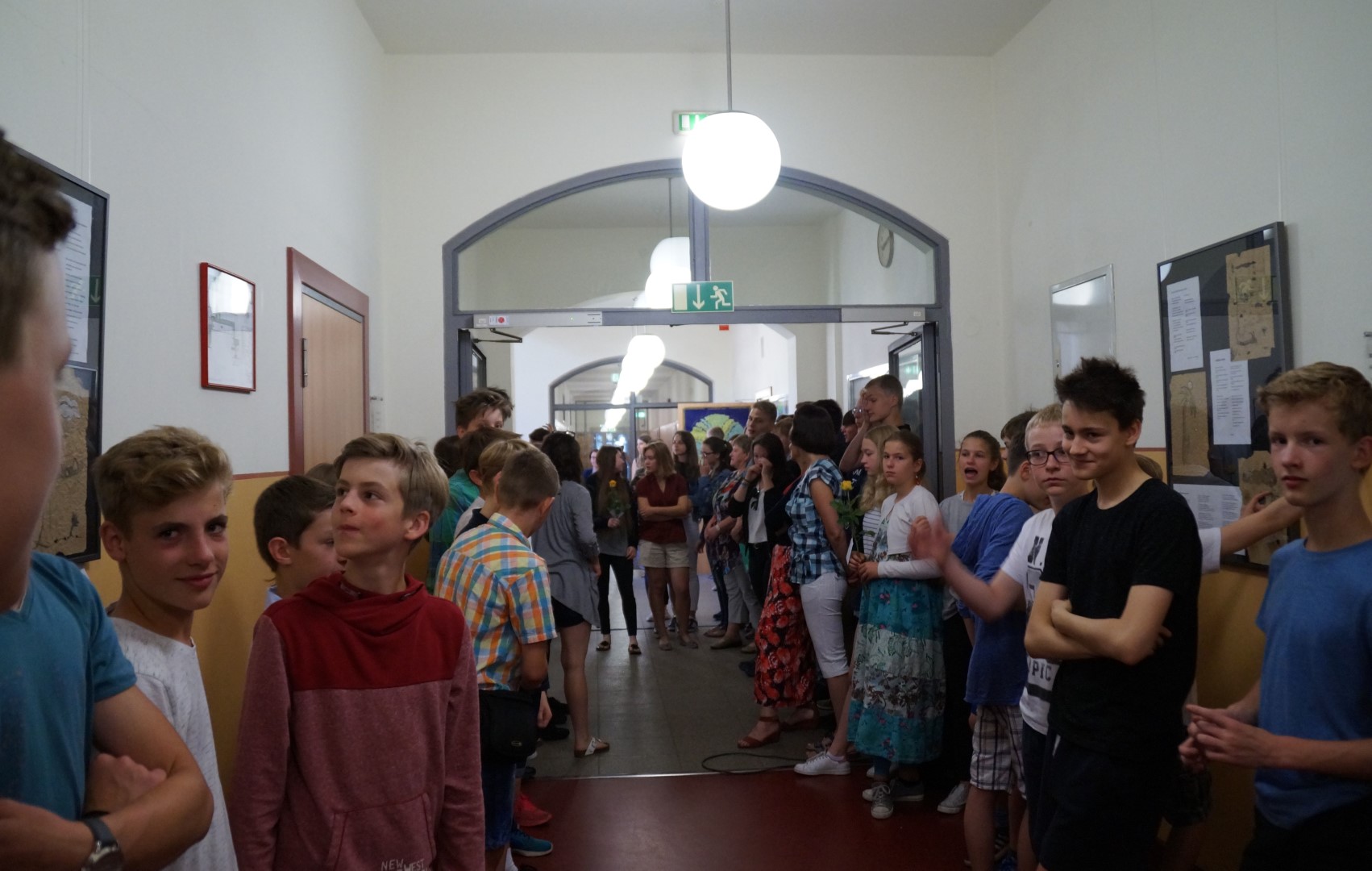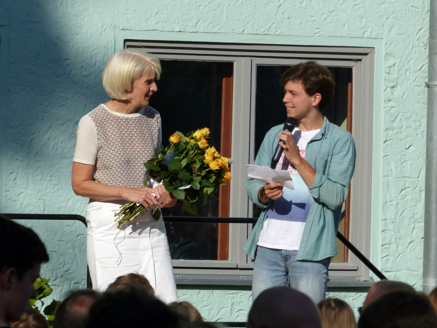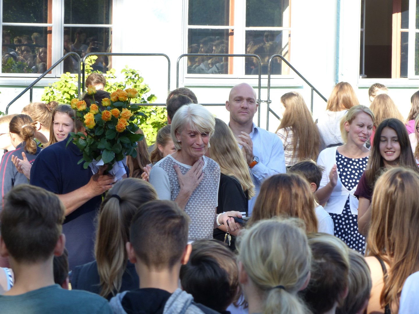 Dafür wollten sich die Schüler einmal bedanken. Die gesamte Schülerschaft bildete eine Gasse von Frau Thieles Büro durch das Treppenhaus und das Foyer bis auf den Schulhof zum Bühnenaufgang, sodass Frau Thiele mit tosendem Applaus und emotinaler Musik überrascht wurde, als sie sich auf den Weg zum Schulhof machte. Außerdem standen an mehreren Punkten der Gasse SchülerInnen mit Rosen und persönlichen Grußzetteln, sodass eine sichtlich überwältigte und ergriffene Frau Thiele am Ende mit einem riesigem Rosenstrauß und vielen guten Wünschen auf die Bühne trat. Niklas Schenk, ein ehemaliger Schülersprecher, hielt im Anschluss eine kurze Rede.