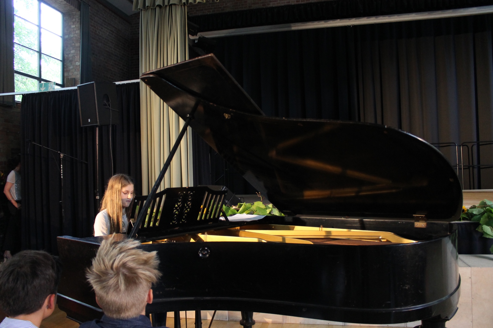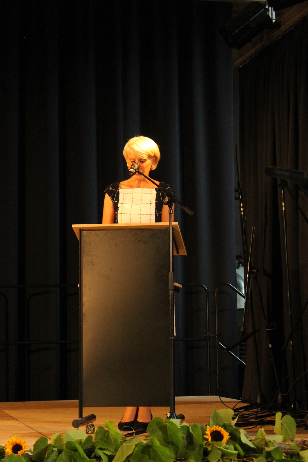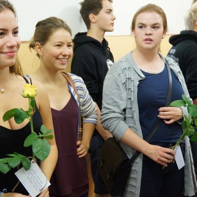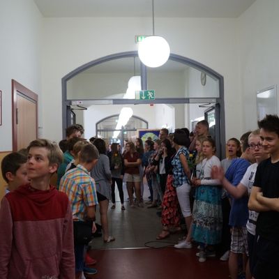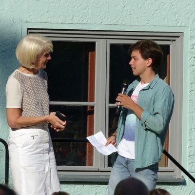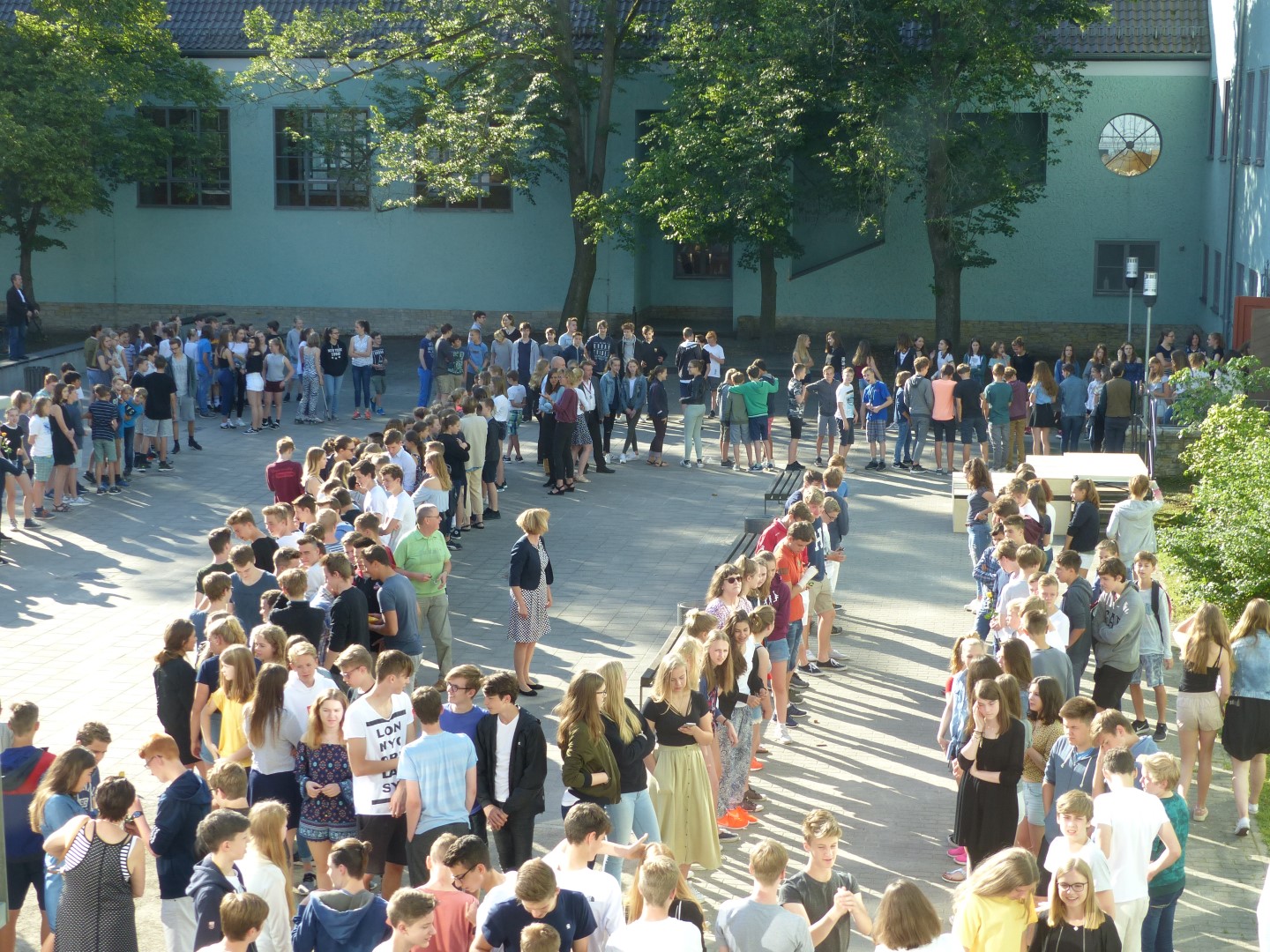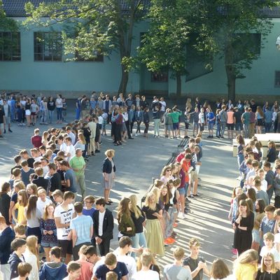 Dafür wollten sich die Schüler einmal bedanken. Die gesamte Schülerschaft bildete eine Gasse von Frau Thieles Büro durch das Treppenhaus und das Foyer bis auf den Schulhof zum Bühnenaufgang, sodass Frau Thiele mit tosendem Applaus und emotinaler Musik überrascht wurde, als sie sich auf den Weg zum Schulhof machte. Außerdem standen an mehreren Punkten der Gasse SchülerInnen mit Rosen und persönlichen Grußzetteln, sodass eine sichtlich überwältigte und ergriffene Frau Thiele am Ende mit einem riesigem Rosenstrauß und vielen guten Wünschen auf die Bühne trat. Niklas Schenk, ein ehemaliger Schülersprecher, hielt im Anschluss eine kurze Rede.