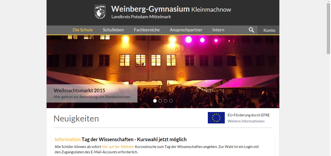 Zum Ende des Schuljahres 2014/15 wurde dann das nächste größere Update veröffentlicht. Hier wurde das bisherige Menü komplett entfernt und durch ein Drop-Down-Menü ersetzt. Außerdem wurde das Design nochmals verbessert und ein Slider auf der Startseite hinzugefügt, der Hinweise auf aktuelle Termine und neue Inhalte bietet.