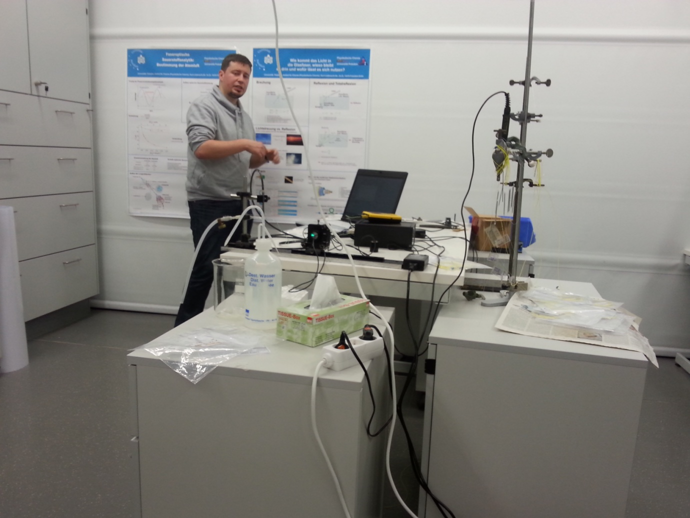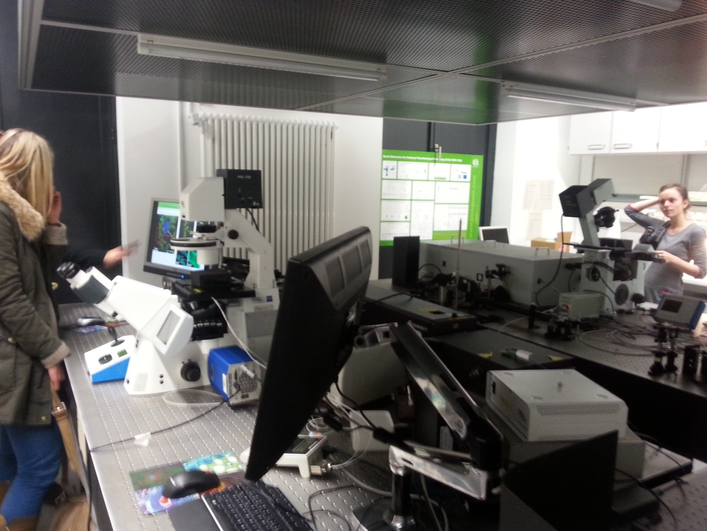 In einem Labor wurden Experimente und Forschung zu Glasfaserkabel in Verbindung mit Lasern durchgeführt. In einem weiteren Labor konnten wir uns selbst praktisch an einer Forschung zu einer speziellen Farbe im Zusammenhang eines Glasfaserkabels beteiligen. Im dritten Labor wurden Forschungen zu Mikroskopen durchgeführt. Dort wurden Speicheldrüsen einer Küchenschabe untersucht.